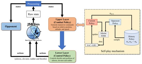 In recent years, along with the continuous advancement of UAV technology, the Unmanned Combat Aerial Vehicle (UCAV) is exerting an increasingly crucial role on the battlefield. However, in order to fully exploit the performance of UCAVs and achieve high-intensity air combats, UCAVs must be liberated from ground control and have a high degree of autonomous decision-making. Simultaneously, the combination of deep neural networks and machine learning has triggered a new research upsurge in artificial intelligence. In 2016, AlphaGo [1] defeated the human Go champion, drawing worldwide attention. On the one hand, AlphaGo’s victory placed reinforcement learning on the historical stage, and on the other hand, it also verified the application potential of reinforcement learning in game issues. Reinforcement learning has had some successful applications in the military. In the DARPA (Defense Advanced Research Projects Agency) Subterranean Challenge, which began in 2018, competing unmanned ground vehicles used reinforcement-learning techniques to learn to navigate and perform tasks in complex environments, such as opening doors or crossing obstacles. The U.S. Army is developing a Synthetic Training Environment that incorporates RL to create adaptive virtual enemies for training purposes. These AI-controlled adversaries learn and adapt strategies based on the actions of human soldiers. The U.S. Navy has experimented with RL in coordinating drone swarms for maritime reconnaissance, where individual drones learn to work together efficiently in reconnaissance missions. In the DARPA AlphaDogfight trials in August 2020, the intelligent flight autonomous decision-making system designed by the American Heron Company successfully defeated the F-16’s flight instructor with a score of 5:0, attracting the attention of military powers worldwide. Intelligent air-combat decision-making has become a research hotspot for all military powers presently.