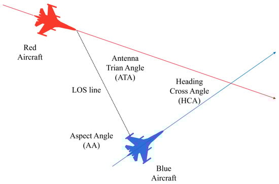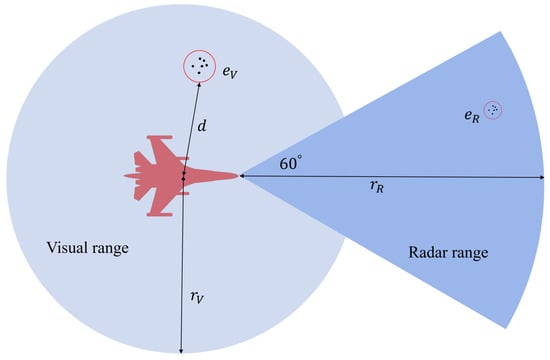 Numerous studies on aircraft maneuvers for air combat assume comprehensive knowledge of both one’s own aircraft and the target’s information [10,11,12,13,14]. However, in real-world scenarios, specific details such as the position, orientation, and velocity of the target can be imprecise due to limitations in sensor capabilities, measurement errors, and fluctuating weather conditions. Moreover, pursuing an opponent is not always successful, leading to situations where target information becomes unobtainable. Therefore, for an air-combat model to be applicable to actual aircraft operations, it is crucial to incorporate the constraints and inaccuracies associated with the aircraft’s integrated sensor systems.