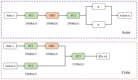 The diagram of the actor network and critic network in this article is shown in Figure 5. The network architecture of the SAC+GRU algorithm consists of two parts: actor network and critic network. The actor network takes the observed feature vector o as input, passes through the fully connected layer FC1, and uses the ReLU activation function to enhance feature extraction. The subsequent layer is a GRU layer that enables the algorithm to extract timing information and improve decisions based on the current state. After the GRU layer is the fully connected layer FC2, which uses ReLU activation functions to process the output of the GRU layer. Finally, a full connection layer produces the average and , used to resampling from Gaussian distribution . The resulting action a is obtained by the tanh activation function.