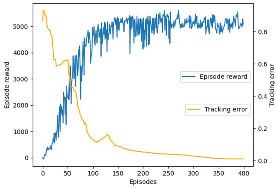 According to the experimental results, we finally determined the coefficients = 1.22 and = 0.27 as our control policy. The learning curves of the control policy are shown in Figure 7, which is obtained by averaging the results of 5 repeated experiments, where the blue curve represents the average reward, and the yellow curve represents the tracking error. The tracking error is determined by the sum of roll angle, pitch angle, and speed difference. At the initial stage of training, the reward increases rapidly, and the average tracking error decreases. After about 200 episodes of training, the two curves gradually converge. The average reward per episode converges to about 5000, and the average tracking error converges to about 0.01. This shows that the control stability and tracking performance are improved with the iteration of training. The convergence of the tracking error curve to 0.01 indicates that the tracking error angle of the convergent agent is less than 1 degree and the speed difference is close to 0.