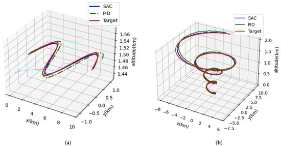 We tested the tracking performance of SAC and PID in two different scenarios: (a) sinusoidal signals and (b) Random signals. Figure 8 shows the tracking results of two control policies under two target signals. Both can stably track target course, altitude and speed. However, compared with the PID controller, the SAC control policy has advantages in overshoot, response speed, stability time and steady-state error. The control policy based on reinforcement learning can track the target signal quickly and smoothly, while the PID controller has obvious oscillation. In addition, model-free reinforcement-learning algorithms do not require complex analysis of aircraft dynamics to find superior policies that can be applied to a wider range of scenarios.