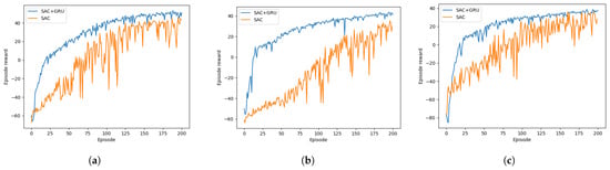 Average episode reward of SAC+GRU and SAC in restricted observation space. (a) = 10 km; (b) = 3 km; (c) = 1 km.