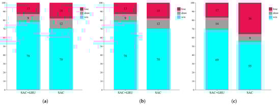 Combat results of SAC+GRU and SAC in restricted observation space. (a) = 10 km; (b) = 3 km; (c) = 1 km.