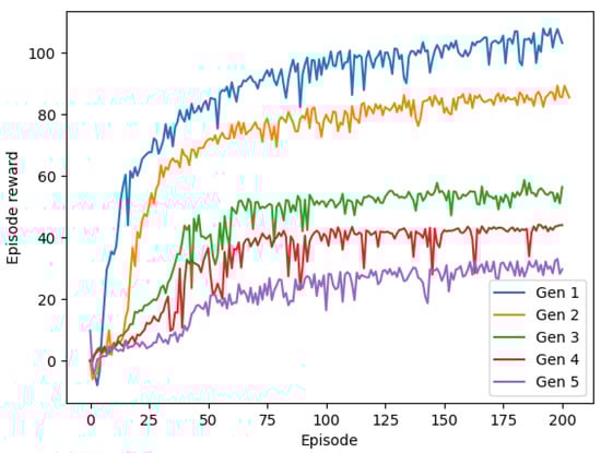 We ran a total of 5 iterations, as shown in Figure 11, with each curve representing the average reward of the current generation versus the previous generations. All learning curves grow with the number of training steps until they converge. This suggests that each generation’s policy has an advantage over the previous one. In addition, with the increase of algebra, the growth rate of the curve begins to slow down, the convergence value decreases, and the standard deviation increases. This is because the improvement of the policy allows the new policy to accumulate absolute advantages over a long period of time and magnifies the impact of wrong actions. After the training was completed, we conducted 100 tests between every two generations, the results of which are shown in Table 4. Our older generation combat policies have a higher win rate than our younger generation combat policies. This indicates that the course-learning method based on self-game can achieve a more stable policy learning process by interacting with its own past version. Statistics show that each generation has a higher victory rate in battles with the previous generation. But at the same time, as the number of iterations increases, the advantages begin to decrease until they converge to the optimal policy.