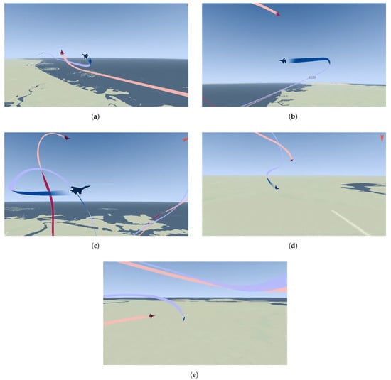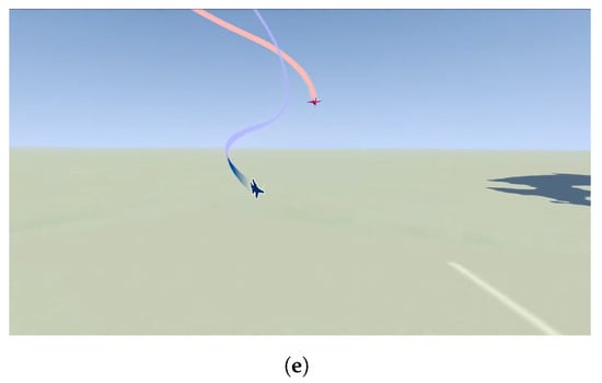 Figure 15 shows the agent’s policy under adverse initial conditions. The initial height, speed, and position of the agent are all at a disadvantage. The agent first tries to induce the opponent to overshoot by rolling scissors and barrel-rolling maneuvers while diving to recover energy. After that, the opponent chooses to pull up to avoid overshooting. At this point, the agent and the opponent enter the scissors maneuver in the vertical direction and take advantage of the smaller turning radius.