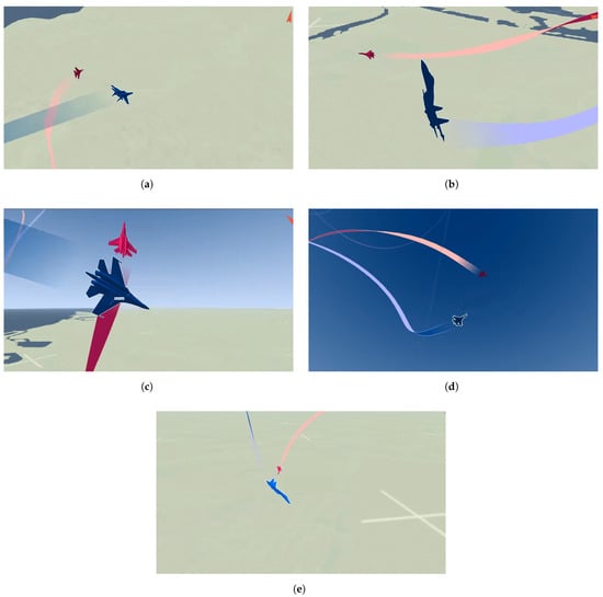 Early studies were carried out in simplified environmental and dynamic models. The current aerial combat setting can be classified as either a two-dimensional or a three-dimensional space. Some studies, such as the work in [7], ignore the altitude aspect of UAVs, effectively reducing the combat space from three dimensions to a two-dimensional surface. These researchers have utilized platforms like DCS World to simulate one-on-one aerial combat scenarios and have endowed UAVs with the ability to make intelligent maneuver decisions. In an attempt to simulate the aerial combat scenario more accurately, various scholars have delved into the study of 3D combat situations. For instance, the work in [8,9] introduced a deep reinforcement-learning (DRL) algorithm for UAVs to make intelligent decisions, leveraging virtual reality technology. They trained UAVs in a 3D virtual environment using the Unity3D platform, enabling the visualization of the combat process in three dimensions.