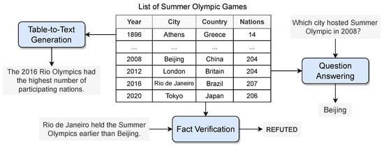 - Chen, W.; Wang, H.; Chen, J.; Zhang, Y.; Wang, H.; Li, S.; Zhou, X.; Wang, W.Y. TabFact: A Large-scale Dataset for Table-based Fact Verification. In Proceedings of the International Conference on Learning Representations, Online, 26–30 April 2020. [Google Scholar]