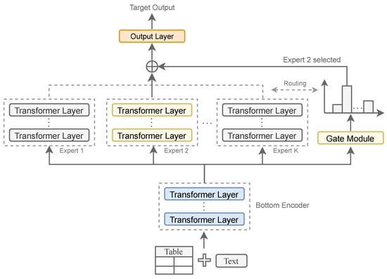 The overall framework of the TabMoE. The table–text pair is input into the bottom encoder for semantic representation, then it goes through the gate module to select and activate a suitable expert, and the selected expert performs corresponding logical reasoning for the final output. All the encoders and experts are constructed by several transformer layers.