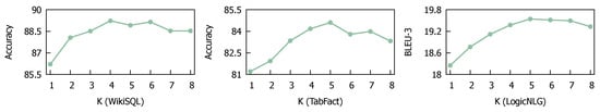 - Number of experts. To evaluate the influence of a gate module and the number of experts on model performance, we carry out experiments with different numbers of experts on three tasks. The corresponding results are graphically depicted in Figure 3. It is discernible that disparate datasets exhibit a degree of commonality in observed trends. When the number of experts , which is equivalent to not having a gate module, the ablation experiment results clearly demonstrate that the introduction of a gate module leads to significant performance improvements across these tasks. The improvement is particularly evident in simpler tasks, while in more complex tasks, a gate module needs to be combined with suitable experts to fully realize its potential. Considering the overall trend, there is a marked upswing in model performance as the number of experts increases. However, after reaching a certain threshold, the results undergo a notable plateau, followed by either an oscillation or decline. The optimal number of experts reaching peak performance in WikiSQL is smaller than in other two datasets, which is possibly attributable to the lower demand for logical reasoning ability in WikiSQL. The observed performance decline can largely be attributed to limitations in the dataset’s quality and quantity. Finer subdivisions may cause insufficient training data for each expert, impeding adequate training for both the gate module and the experts, and thereby negatively impacting model performance. Additionally, increasing the number of experts results in a rapid increase in model parameters, necessitating the identification of a suitable number. The selection of the optimal number of experts should be made based on the difficulty and the quality of the dataset, ensuring the gate module’s discriminative efficacy and the experts’ inferential capabilities.