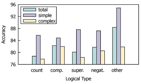 Figure 4. The accuracy of different logical types on TabFact. - Differentiation among experts. The differentiation of the experts is necessary for performing different logical operations in the TabMoE. To assess this, we evaluate the outputs of individual experts. We first test each expert’s ability in handling all logical types of data within TabFact. This experiment removes the gate module, with each expert tasked to analyze every sample in the test set. For each sample, the count of experts predicting correctly is recorded. Figure 5 illustrates the correlation between the count of experts k and the proportion of correct predictions within the test set. Evidently, as k increases, the proportion of samples correctly predicted by k experts gradually decreases. This trend suggests that certain data require specific expert reasoning for accurate results, thereby highlighting the variances among the experts. Additionally, we indirectly verify the differentiation of the experts by measuring the diversity of generated sentences on the LogicNLG dataset. The self-BLEU metric [42] is employed for this purpose, which replaces reference text in the conventional BLEU metric with the generated text itself. Self-BLEU is computed by calculating the BLUE score of each sentence with the rest of the sentences in a generated collection and then averaging the BLEU scores of all generated sentences. A lower self-BLEU score corresponds to a higher diversity of generated outputs. The results, as presented in Table 6, demonstrate that the text generated by the TabMoE displays significantly better diversity compared to other models (we only compare diversity among models with available source codes). This observation underscores the capacity of the experts in generating more diverse text, thereby confirming the obvious distinctions among the experts. Simultaneously, this feature confers an additional advantage to these generative tasks, enhancing the diversity of generated outputs—an aspect often overlooked by other models.