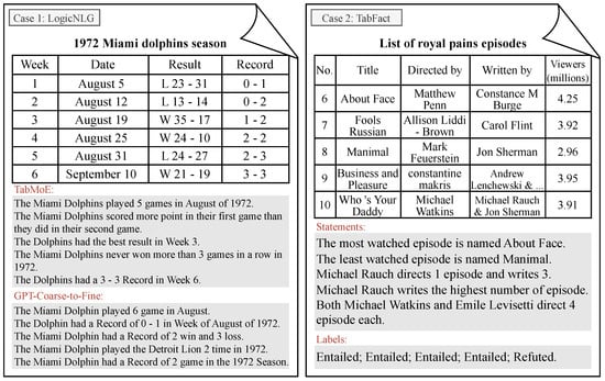 The first case is drawn from LogicNLG dataset, where the gray parts represent the sentences generated by the TabMoE and the GPT-Coarse-to-Fine model. The second is taken from TabFact dataset, with the gray parts representing the statements that require verification and annotated labels. For clarity of presentation, both tables omit some content.