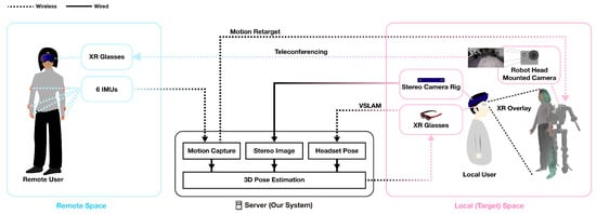 The local user is equipped with an HMD for visual communication, augmented with a stereo camera rig to observe the local space. Given the stereo rig imagery, our proposed learning-based robot pose estimation approach estimates the 3D pose of the observed robot in the local space. The estimation is wirelessly sent to the XR headset of the local user, and the HMD visualizes the digital avatar of the remote person in the estimated position and pose so that the visual avatar is overlaid on the humanoid robot from the local user’s perspective for immersive 3D visual interactions. The details of the learning-based humanoid robot pose estimation method are described in Section 4. Additionally, the local user can physically interact with the remote person through the humanoid robot avatar.