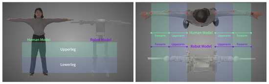 To accurately overlay the digital human model onto the humanoid robot, we adjust for differences in shape and height between the user and the humanoid robot. Using the Unified Robot Description Format (URDF) of our humanoid robot, we manually rescaled the prescanned rigged human model, as shown in Figure 4, improving the 3D alignment between the humanoid robot and the digital human model in the XR headset.
