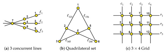 (a) Three concurrent lines; (b) quadrilateral set ; (c) grid .