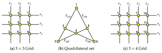 Specifically, Theorem 1 offers a geometric approach to generating certain polynomials in the ideal , as demonstrated in Proposition 4. In Section 4 and Section 5, we illustrate how these polynomials suffice to generate the matroid ideal for the quadrilateral set and the grid. Moreover, we address Question 1 for these two matroids. More precisely, we provide a characterization of 6-tuples of collinear points that can be lifted to a quadrilateral set, and of 12-tuples that can be lifted to a grid. For the quadrilateral set, this provides a new characterization, equivalent to the one in [25,26].