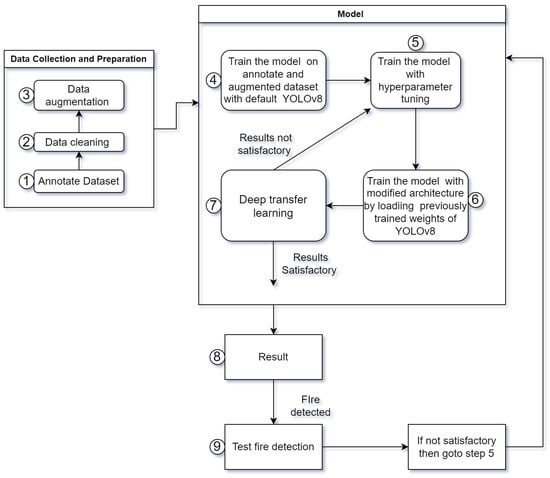 Detailed workflow of the proposed fire detection model development using YOLOv8.