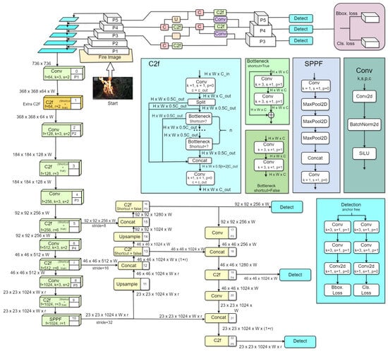 Our suggested method provides a significant improvement to the YOLOv8 design by carefully adding an extra context-to-flow (C2F) layer to the backbone network. The goal of this change is to enhance the model’s ability to capture contextual information about fire, refine features, and improve fire detection accuracy [32]. Figure 3 shows the overall architecture of our proposed model. Here, we present an outline of our suggested method. It is based on the YOLOv8 model, which was chosen due to its superior accuracy and efficiency compared to previous versions of the YOLO model. The C2F module was introduced to provide the model with enhanced capabilities to capture both contextual and flow information crucial for accurate fire detection [32]. We added an extra C2F module after the first conventional layer, which facilitates the model in gathering both environmental and flow data necessary for accurate fire detection, as shown in Figure 3. In the original YOLOv8 backbone, the first two convolutional layers were able to extract simple low-level features like edges, textures, and gradients. The context-to-flow (C2F) layer was missing, which means the model likely did not have a lot of capacity to capture and propagate contextual information early on, which could inhibit its ability to learn complex spatial relationships in data. By inserting a C2F layer between two convolutional layers, how to capture the complex cross-scale features, compounds, and spatial dependencies at the beginning of the network was solved. It resulted in a better distribution of features, which made the network more capable of distinguishing between useful and non-useful patterns, resulting in significant enhancements in accuracy, robustness, and generalization. The C2F layer increases feature extraction ability and guarantees that more context-aware representations are obtained earlier in the network, enabling it to achieve good performance on tasks such as fire detection.