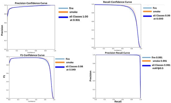 Our findings reveal that the proposed model accurately detects 98% of fires and 97.8% of smoke. The recall rate for fire is 97.1%, and the recall rate for smoke is 97.4%. The mean average precision (mAP) for both classes was 99.1%. The loss, precision, and recall metrics, which reflect the overall performance of the proposed model, are illustrated in Figure 6.
