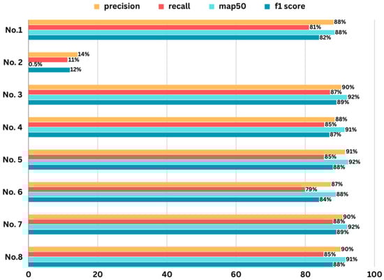 Performance charts of the precision, recall, map50, and F1-scores for the combinations shown in Table 3.