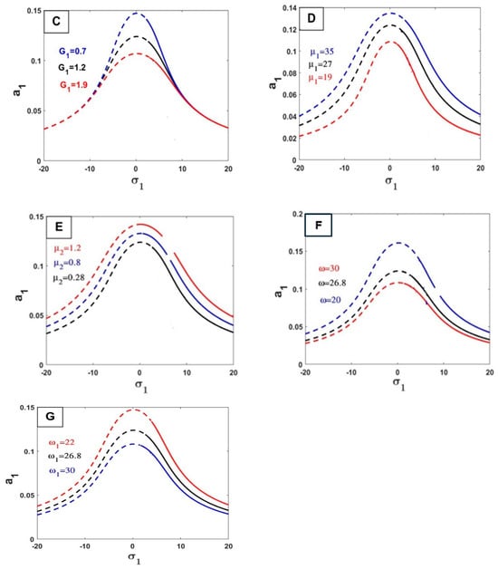 In Figure 5, we studied the change in parameter values and their impact on the relationship between the response curves of stability of the steady-state amplitude a1 against . If the force increases significantly, it does not affect the increase or decrease in amplitude, but rather affects points of stability and instability. However, with a very large increase in force for external environmental conditions, the force can turn out to be a tranquilizer and reduce the frequency, as shown in Figure 5A. By increasing the values of the parameters () on Figure 5B,D,E, the value of the amplitude frequency increases. In other words, the opposite happens with these values () on Figure 5C,F,G; by increasing these values, the amplitude-frequency decreases. Finally, by increasing and decreasing the amplitude under effect of parameter the region of stable and unstable will change.