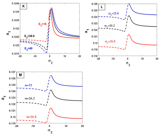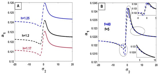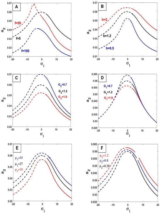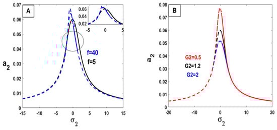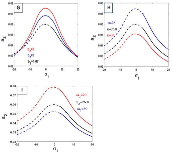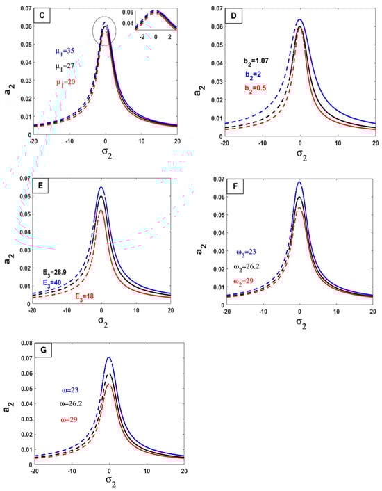 In Figure 8, we show the change in parameter values and their impact on the relationship between the response curves of stability of the steady-state amplitude a2 against σ2. By increasing the values of the parameters () on Figure 8A,C,D,E, the value of the amplitude frequency increases. In other words, the opposite happens with these values () on Figure 8B,F,G, by increasing these values, the amplitude frequency decreases.