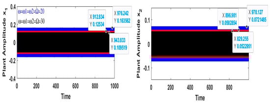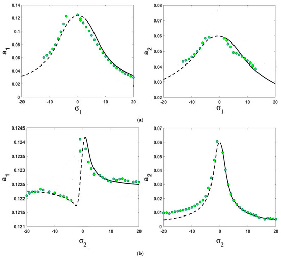 The stable solutions are examined for the framework’s stability. and the fixed points’ periodic solution in Equations (24)–(27), which led to the following equations being derived from the frequency response equations shown as follows: