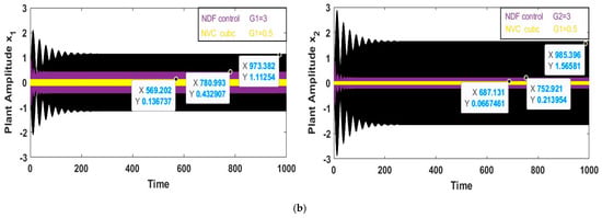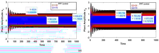Figure 12 shows the result of multiple control methods applied to the worst case. By examining those types, we were able to choose the control that has a greater effect on the system, in this case a simple harmonic hump y = h sin () where h is the height of . Figure 12a studies PPF in two cases and Figure 12b studies CNVC and NDF; the results show that CNVC was the most effective, as shown in the figures above, since it was able to manage and minimize the vibration as much as it could.
