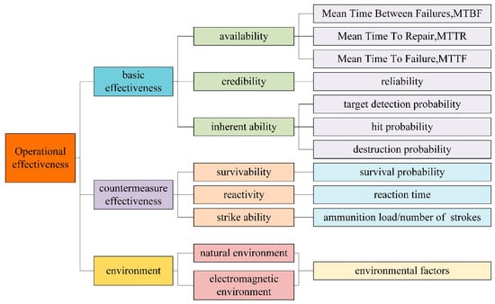 In the process of aerial attack–defense game confrontation, the main players involved in the game are the red and blue players, respectively. There are great differences in the parameters, such as the performance and value of the two players in the game. The strategic gains of the both game players are not only disturbed by many factors—such as the probability of aircraft finding the target, the probability of the penetration survival of the equipment, the probability of hitting the target, the probability of destroying the target, the reaction time of the equipment, the number of bombs or strikes, the environment, and the value of the target—but also affected by the asymmetric imbalance of the strategy combination of both players of the game and the competition conflict within the cluster. In order to analyze the influence of the deployment of new equipment on the evolution of the air attack–defense confrontation behavior of the game players, this paper introduces the equipment operational effectiveness index system to establish a mathematical model of the air attack–defense confrontation behavior of the game players and analyzes the attack–defense evolution process of the game players. The operational effectiveness of equipment is primarily influenced by a combination of basic effectiveness, countermeasure effectiveness, and environmental factors [23,24,25]. The details are shown in Figure 1.