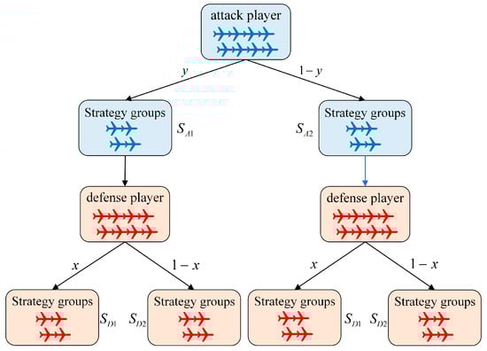 The blue player’s strategy set is , representing a coordinated attack and an independent attack strategy, respectively, and the corresponding choice probabilities of the cluster are (). Correspondingly, the red player’s strategy set is , representing a coordinated attack and an independent attack strategy, respectively, and the corresponding choice probabilities of the cluster are (), where . The game tree formed in the process of attacking and defending is shown in Figure 2.
