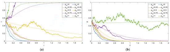 Under the condition that the initial values of other parameters remain unchanged, only the value of the basic probability of equipment operation changes, and the influence of different values of on the game evolution result is analyzed. Taking the laser equipment damage probability as a reference for illustration, let take the value , respectively, the simulation results are shown in Figure 4, where the dashed line indicates the deterministic evolution curve, and the solid line indicates the stochastic evolution curve.