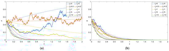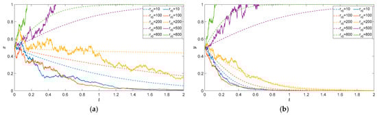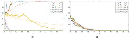In order to confirm the correctness of the above theoretical derivation and verify the validity of the model, the decision-making evolution process of the two sides of the game is simulated and analyzed by Matlab 2023b (developed by MathWorks, Natick, MA, USA). Before the numerical simulation, it is necessary to initialize the numerical simulation according to the system stability constraints, so the following values are based on the previous constraints. The initial selection probability of both players of the game is set to , the intensity coefficients of random environmental disturbances are taken as , the step size of the simulation is 1, and the other parameters are set to values that satisfy the stability of Equations (17) and (18) according to the constraints. The specific values of the relevant parameters are: , , , , ; , , , , , , ; . Figure 3 shows the dynamic evolution process of the game player strategy under the conditions of different interference intensities.