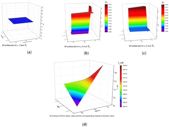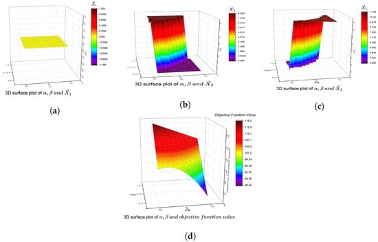 The diet problem has been solved using the method proposed in this paper. The comparison of results with the proposed method are shown in Table 7. Figure 3a–d present the 3D surface plots of vs. , vs. , vs. , and , vs. the objective function value, respectively. Using the method proposed in Section 4 the solution is (for ), (for ), and (for ) with the minimum objective function value for .