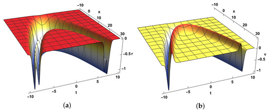 The profiles of single solitons described by Equation (28) are shown in Figure 1. Figure 1a,b are the 3D plots of and . Figure 1c,d are the density plots of and .