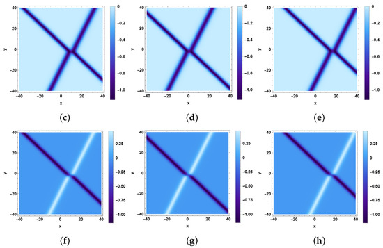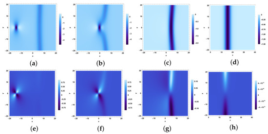 The profiles of breather waves given by Equation (44) are shown in Figure 4. Figure 4a,b are the 3D plots of and . Figure 4c–h are the density plots of and with different values of .