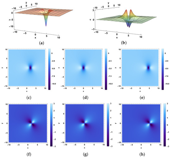 The profiles of single-lump waves described by Equation (38) are shown in Figure 3. Figure 3a,b are the 3D plots of and . Figure 3c–h are the density plots of and with different values of .