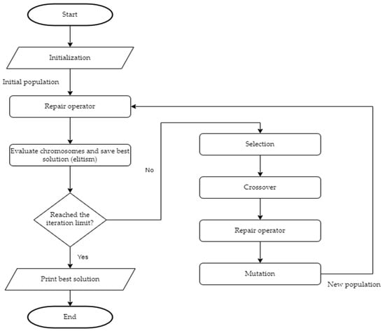 The flowchart of the proposed GA presented in Figure 1 illustrates a general concept with an integrated repair operator. Initially, a population is generated at the start of the proposed GA. Due to the potential creation of invalid chromosomes in this initial population, a repair operator is applied subsequently. Its role is to ensure that all chromosomes within the population are valid before advancing to subsequent operations. Once a valid population is established, each chromosome is evaluated, computing its fitness function value, and the best solution is stored in a black box. After evaluation, the algorithm checks if the iteration limit has been reached. If not, the population proceeds to the selection operator, which forms a new intermediate population by selecting chromosomes based on their fitness values. The intermediate population then moves to the crossover operator, where certain chromosomes exchange genetic information to explore the solution space and create a new intermediate population. Since invalid chromosomes may arise during crossover, the repair operator is applied again to ensure that only valid chromosomes enter the mutation operator. The mutation operator further explores the solution space, particularly in cases where a crossover operator alone is insufficient. Following mutation, a new population is formed, and the algorithm cycle returns to the repair operator and evaluation. In each iteration, the best solution in the black box is updated if a superior solution is found. The algorithm concludes when the iteration limit is reached, and the best solution is presented to the user. Figure 2 provides a visual overview of the GA framework.
