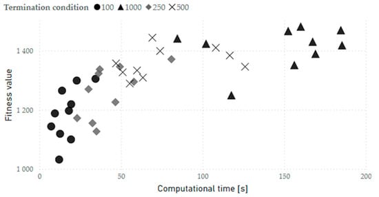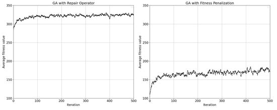 By penalizing invalid chromosomes in the fitness function, we addressed the problem of large numbers of invalid chromosomes in a previous publication [70]. However, this method proved to be inefficient in terms of the quality of the solutions obtained, due to the large number of invalid chromosomes generated during the genetic operators. For this article, both approaches to solving for invalid individuals were tested on generated input data. The results are based on 500 runs of the GA and are presented in Figure 3 and Figure 4.