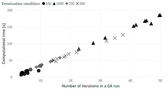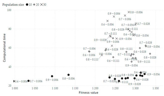 In addition to designing appropriate genetic operators, the efficiency of a GA depends on proper parameter settings (Table 5 and Table 6). Key parameters include population size , crossover probability , mutation probability , and termination conditions. The termination conditions in the proposed GA are the number of iterations and the number of iterations with unchanged best solution .
