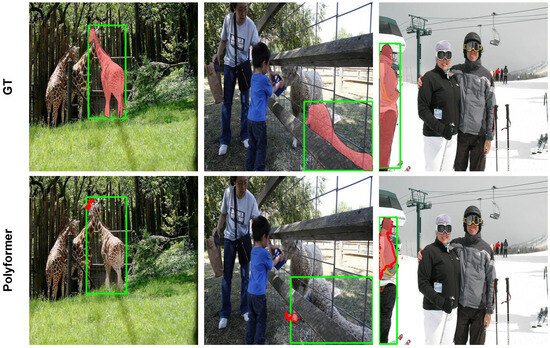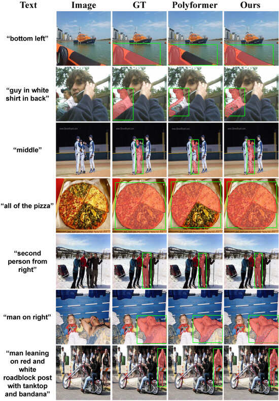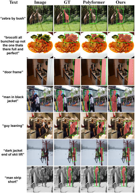 - Liu, J.; Ding, H.; Cai, Z.; Zhang, Y.; Satzoda, R.K.; Mahadevan, V.; Manmatha, R. PolyFormer: Referring Image Segmentation as Sequential Polygon Generation. In Proceedings of the 2023 IEEE/CVF Conference on Computer Vision and Pattern Recognition (CVPR), Vancouver, BC, Canada, 17–24 June 2023. [Google Scholar]