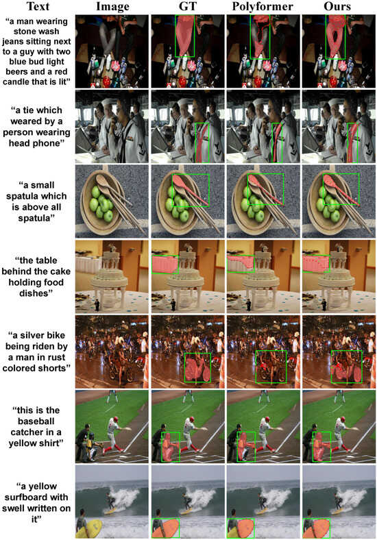 - Yang, Z.; Wang, J.; Tang, Y.; Chen, K.; Zhao, H.; Torr, P.H. LAVT: Language-Aware Vision Transformer for Referring Image Segmentation. In Proceedings of the 2022 IEEE/CVF Conference on Computer Vision and Pattern Recognition (CVPR), New Orleans, LA, USA, 18–24 June 2022. [Google Scholar]