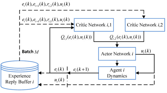 For each agent i, the hierarchical multi-agent consensus algorithm based on action value function decomposition is implemented by the dual-critic network and single-actor network. The corresponding offline training process is shown in Figure 3. The structure is similar to the hierarchical DDPG, but the difference is that the training of the dual-critic network has no primary and secondary order. The dual-critic network learns the control objectives of each layer and aggregates the learned knowledge into the same actor network to obtain the corresponding control value. For the actor network of each agent, the input is the local tracking error , and the output is the control policy , which can be obtained by minimizing the action value function . According to Theorem 1, each agent has a dual-critic network and , output , and , which are used to evaluate the control effect of current control values on the intra-group consensus and inter-group consensus of hierarchical multi-agent systems. For the updating of the critic network, according to the Bellman equation, the temporal difference error is defined as follows: