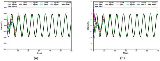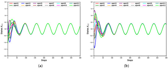 State trajectories of the layered multi-agent systems in Experiment 2. For (a,b), the horizontal axis represents the simulation time steps, and the vertical axis represents the state of the system.