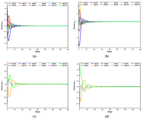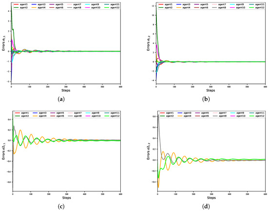 Figure 5 shows the control effect of the algorithm. In a randomly given initial state, the state of all agents can reach consensus after 200 time steps. Figure 6a,b show the convergence process of the intra-group error, and Figure 6c,d show the convergence process of the inter-group error. From all the simulation results, it can be seen that all the agents can reach the same state in 150 time steps.