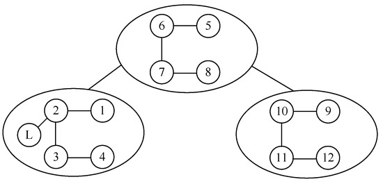 where ⊗ is the Kronecker product, is the n-dimensional unit matrix, is the q-dimensional unit matrix, the state of the h group agent is , the state vector for all agents is defined as , the state vector of the leader agent is , is the value of inter-group state error, and is the information interaction between each group structure. If the multi-agent systems has no leader, then both and are zero.