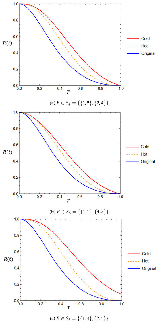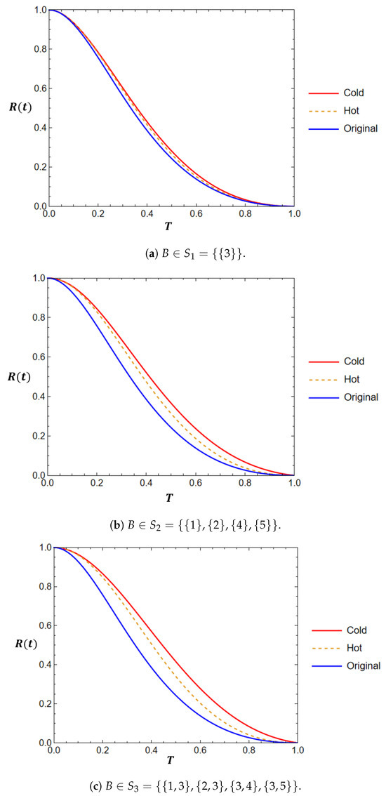 - Additionally, as shown in Table 3, implementing cold duplication for set B within results in an increase of from to . This same effect is observed when reducing the failure rates of set A, particularly for the following components: (i) with , (ii) with , (iii) with , (iv) with , (v) with , and (vi) with , as demonstrated in Table 5.
