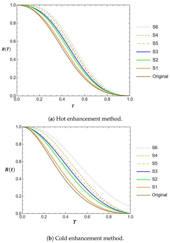 - In the reduction method, the failure rates of components within set A, where for , are uniformly reduced by a factor of . This reduction aims to improve system reliability by lowering the failure rate of specific components.