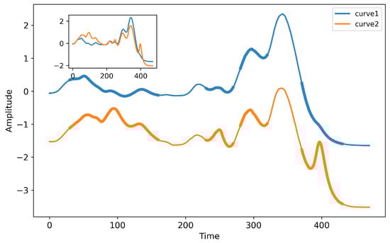 Figure 1 shows two curves belonging to different classes. From the subplot of Figure 1, it can be seen that the Euclidean distance between these two curves is small. Therefore, the reason for their belonging to different classes mainly stems from the differences in their shapes. This means that calculating the dissimilarity between the curves solely on the basis of the Euclidean distance is inappropriate. Instead, information reflecting shape differences should be considered in the dissimilarity measure. Higher-order derivatives such as slope, curvature, concavity and convexity act as intrinsic geometric characteristics of curves, and as such are important factors in the variation of curve shapes. Therefore, a reasonable dissimilarity measure should comprehensively take into consideration both higher-order derivative features and location features.