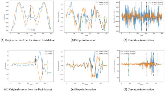 The first column shows curves randomly selected from the ArrowHead and Beef datasets. The second and the third columns respectively present the slope information and curvature information of the corresponding curves. Points exhibiting divergent trends on curves are highlighted with black dashed lines, while those with similar trends are indicated by green dashed lines.