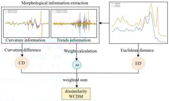 The workflow for the WCDM is provided in Figure 5. First, we calculate the ED between each pair of points on the two curves. Second, the first and second derivatives are computed at every point on each curve. Third, we calculate the curvature and the curvature difference at each pair of points on the curves. Fourth, the weight value at each point is determined using Equation (2). Finally, we calculate the WCDM dissimilarity value according to Equation (1). It is clear that the main differences between ED and WCDM dissimilarity measurements are in the weight calculation and shape discrepancy. Let n denote the length of the curves; the time complexity of the ED for two curves is , while the time complexity of the calculating weights and curvatures is . Therefore, the time complexity of the WCDM is .