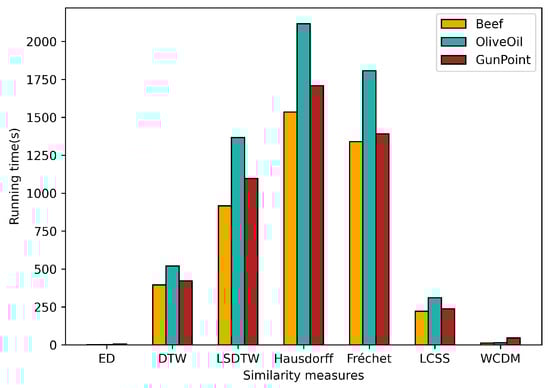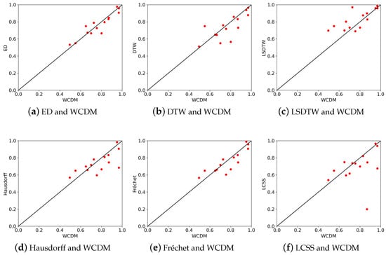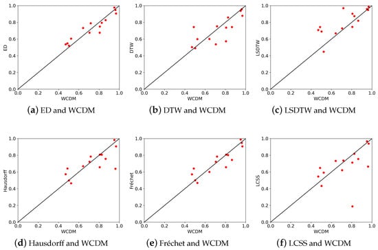 Concerning time complexity, it is noteworthy that the computational complexity of ED is . Analogously, based on Equation (1), we can discern that the computational complexity of the WCDM is . As delineated in [19], both DTW and LSDTW possess computational complexities of . In [6,11], it was indicated that the time complexities for the Hausdorff and Fréchet distances are both . Additionally, employing a dynamic programming algorithm, LCSS can be computed to have a complexity of [21], where n denotes the length of the data.